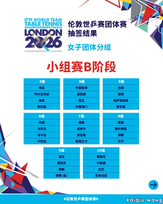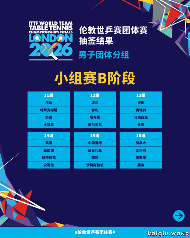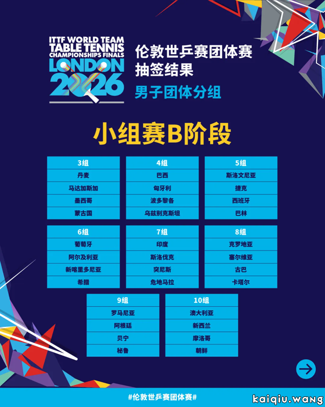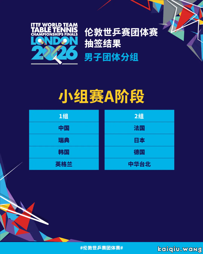 2026年国际乒联伦敦世界乒乓球团体锦标赛决赛(简称:伦敦世乒赛团体赛),将于2026年4月28日至5月10日在英国伦敦举行。第一阶段小组赛签表于今日出炉: