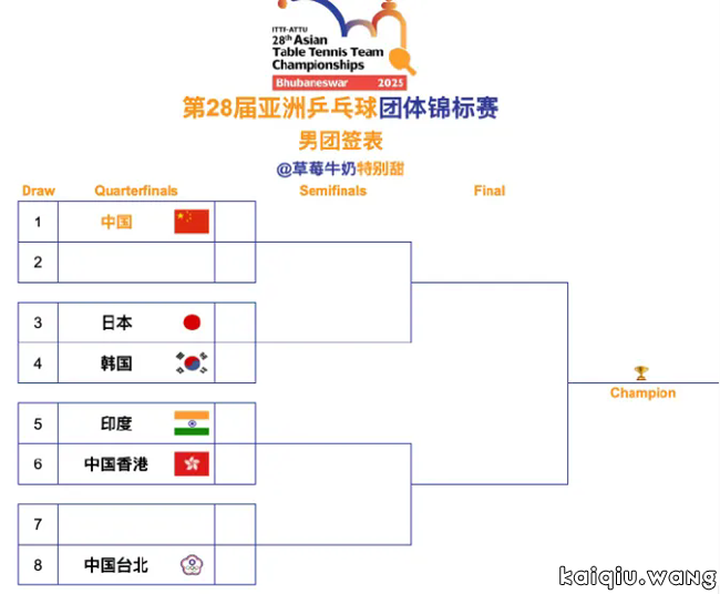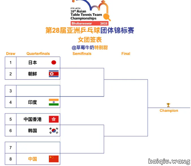 女团方面,以孙颖莎、王曼昱为首的国乒作为二号种子处于下半区,首轮同样对阵小组赛晋级队伍,同区劲敌为中国香港队与韩国队,二者将先展开较量决定晋级名额。头号种子日本女团则遭遇“下下签”,上半区首轮即迎战拥有女单卫冕冠军金琴英的朝鲜队,同区还有东道主印度队的特殊打法挑战,晋级形势充满变数。