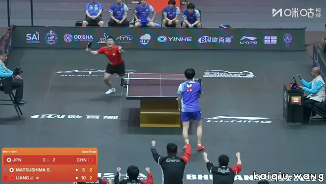 第三盘梁靖崑接力出战,对阵姚钧涛。他延续半决赛的强劲势头,充分利用自身优势展开进攻,频频得分,最终以13-11、11-6、12-10横扫对手,3-0为中国队锁定胜局。