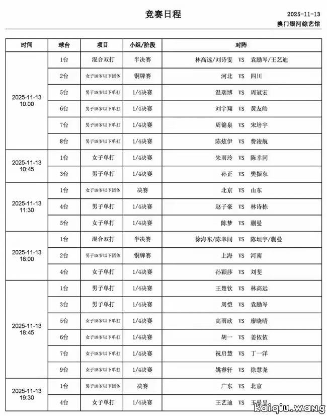 值得注意的是,本次赛事直播渠道明确,央视体育频道、央视频和咪咕视频同步转播,其中央视体育仅挑选部分场次直播,想要全程见证所有对决的球迷,可通过央视频免费收看完整赛事。全运会乒乓赛场从无绝对强弱,临场状态与心态调整往往比技术更关键,11月13日的密集赛程,注定将诞生诸多精彩瞬间,无论是林高远能否顶住体能压力逆袭,还是新生代能否掀翻老牌国手,都值得球迷锁定直播,共同见证。