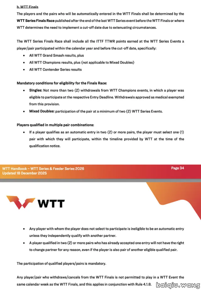 参赛资格方面,新规增设明确强制门槛:单打选手在WTT冠军赛报名截止前符合参赛资格时,最多只能退赛2次,医疗原因退赛可豁免;混双组合则需至少共同参加2站WTT系列赛,方可获得总决赛积分榜入围资格,外卡"空降"现象被杜绝。这一规则将有效遏制"选择性参赛"行为,同时推动混双项目形成更稳定的竞争格局,与国乒等协会长期规划固定组合的思路不谋而合。