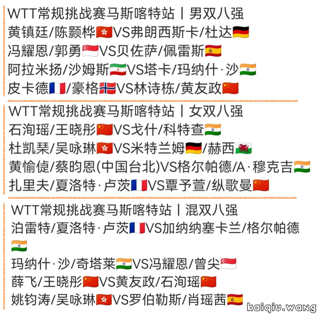 2026年WTT常规挑战赛马斯喀特站,正赛渐入佳境:单打十六强、双打八强全部揭晓。