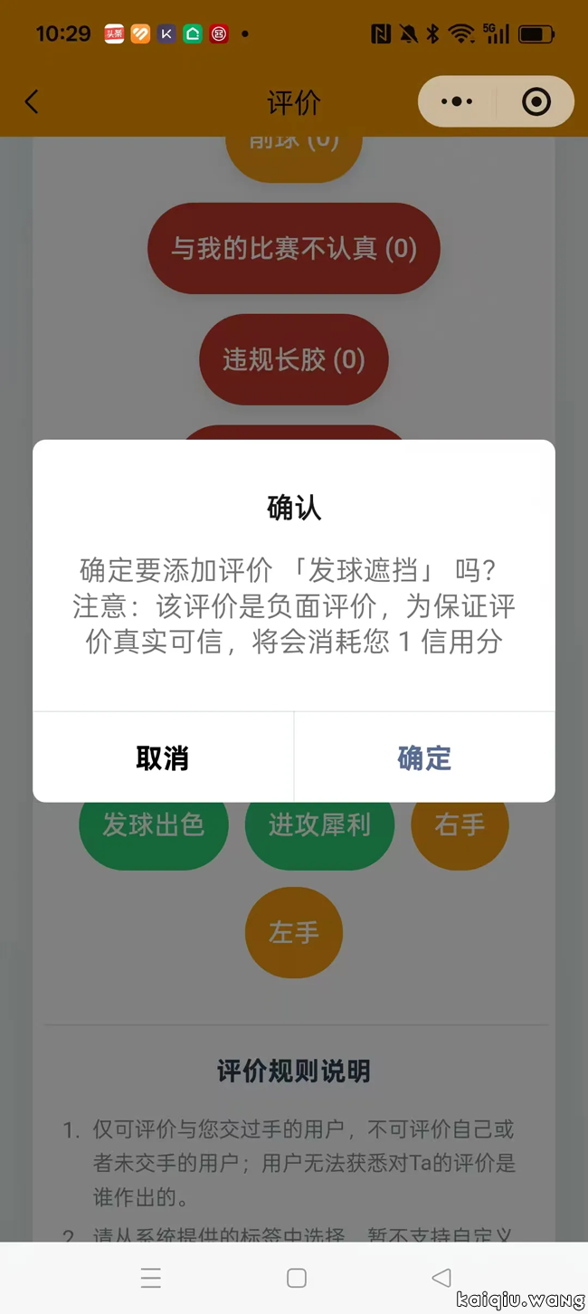 请球友们格外注意:只有交过手的对手,才能“去评价”;为保证评价真实可信,评价的同时会消耗1信用分!